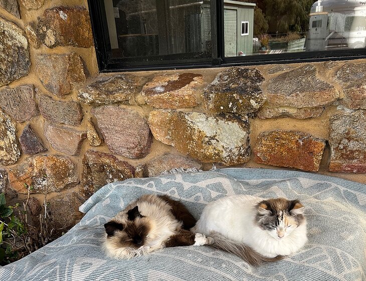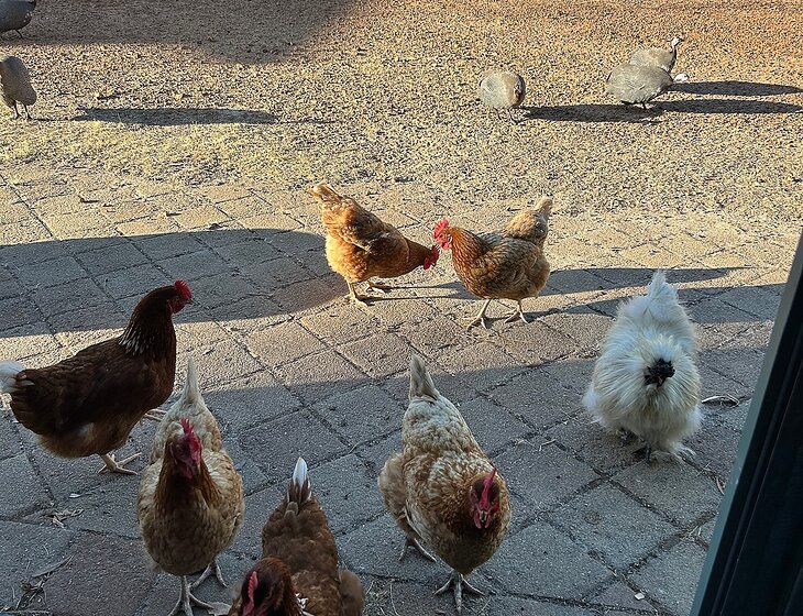The dogs need walking at least once a day and feeding. The cats need feeding once a day in the afternoon with medication for the old boy Herman and their bickies topped up. The chooks are free range so need to be let out in the morning and locked up at night and their food topped up every couple of days. The Guinea fowl just get a handful of grain thrown to them in the arvo.