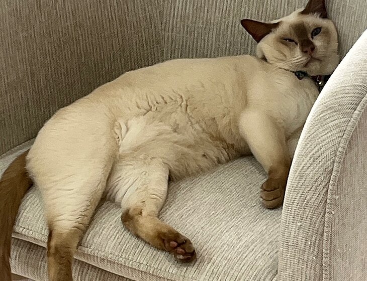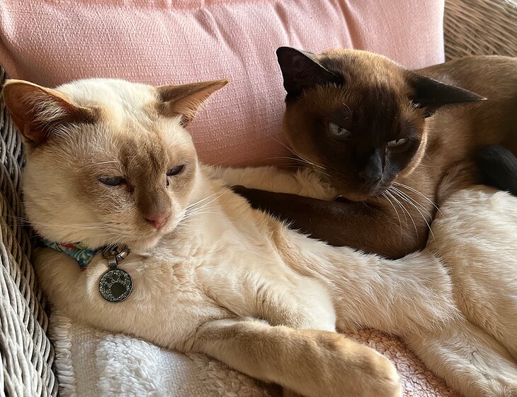 I have Theo who’s 7 years old and Moe who’s 5 years old, both are Tonkinese male and inside cats. Both are super affectionate, Theo is very chilled and Moe as a very playful and sweet. They have no special needs except cuddles and mainly keep each other occupied.