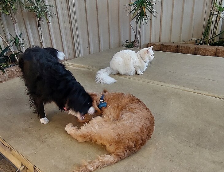 We have two dogs and one cat. The Cat is mid aged and deaf, one dog is 4 years old and a puppy one year old. The older, smaller dog has a habit of sleeping on the end of a bed, preferably one with a human in it. The three animals spend a lot of time indoors sleeping during the day and sleep inside always at night. The dogs enjoy a walk.