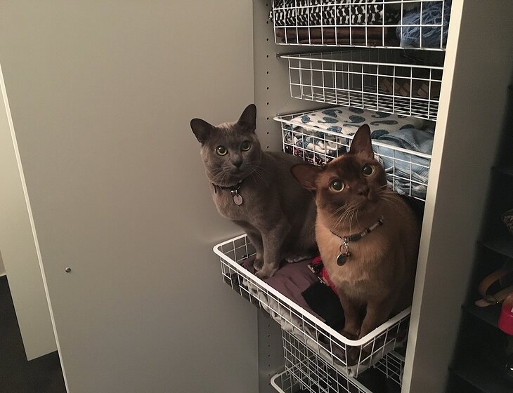 Two inquisitive indoor Burmese cats, Molly and Milo, who like a walk around the yard (on their leads) and enjoy some play time. Milo has some special dietary needs and requires a dose of medicine each day - a liquid easily snuck into his food.