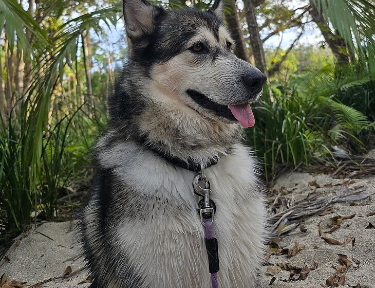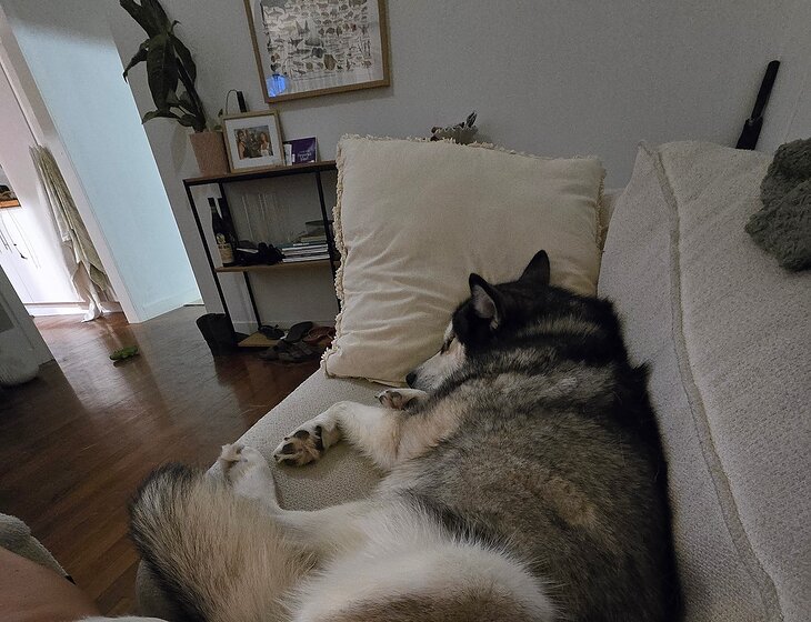 She is a 6 year old Alaskan Malamute with hip dysplacia so she struggles to go for long walks and sometimes struggles to get up steps. She sleeps most of the day inside the aircon but will howl to wake you up when it's time for her morning walk. We just take her for 15 mins preferably when it's cooler than 27 C outside.