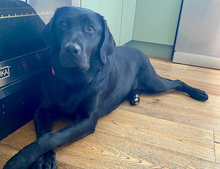 We have a beautiful and well trained 2 year old black Labrador who loves cuddles and a daily walk. She sleeps inside on her dog bed.