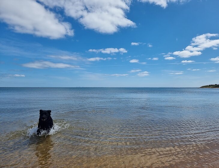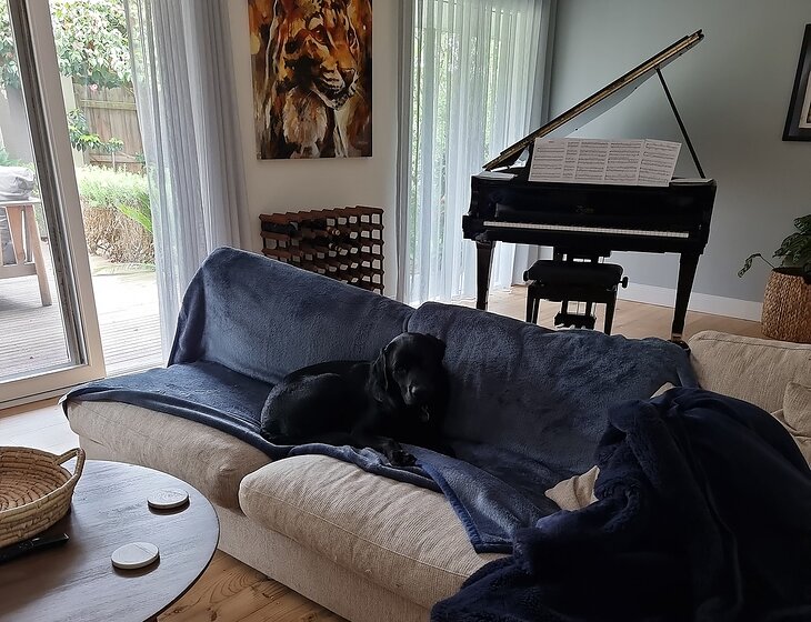 I have a beautiful Goldador named Trevor who is a inside house dog. Very obedient, full of love and cuddles, yet has a deep bark to make you feel secure when he is protecting the home. The house is easy living, cosy, lovely garden surroundings with sun decking area and chimenia, modern bathroom and kitchen. Sitters can expect 1 or 2 queen size bed for use. The home has a beautiful baby grand piano, I would request sitters who are not musically oriented to not touch it plesse as it is my absolute pride and joy. Only a 10-15 minute walk to the dog beach in one direction, in another to the village.