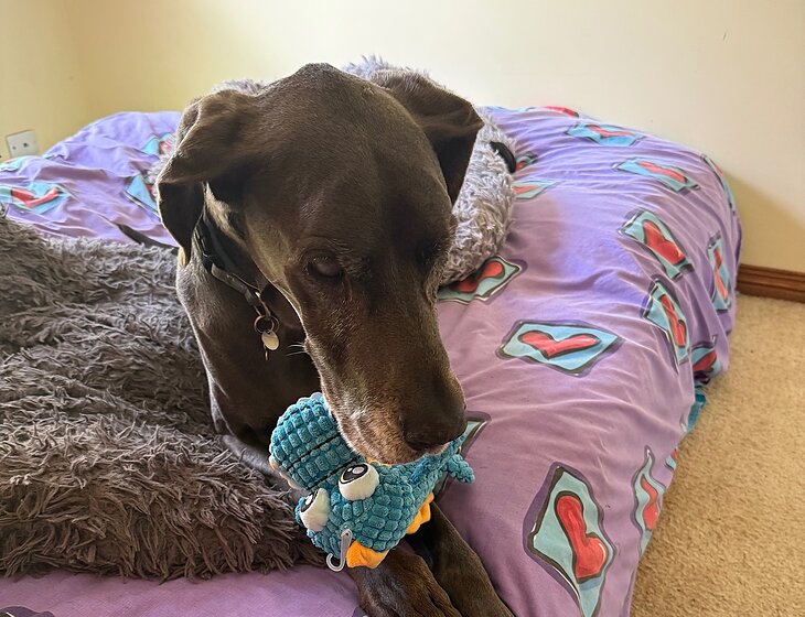 Alfie has limited vision as he has had glaucoma in his right eye and cataracts in his left eye, both issues for which he requires eye drops regularly. However he knows very well his way around the house and back garden and can navigate these areas very well. He loves lots of attention, talking and enjoys a play with his squeaky toys. We sometimes take him for a very short walk (really just a dawdle so he can sniff everything every second or third day.