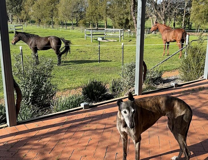 The horses require feeding only. Poppy the greyhound requires company, walks, and cuddles as well as her meals and medication.