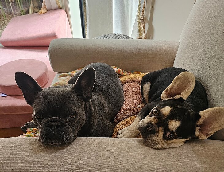 We have 2 French bulldogs, Boston and Bowie, that require daily walks and lots of cuddles. We have 1 devon rex cat, Pepper. She will likely want to snuggle you at night. The boys sleep downstairs in their bed.