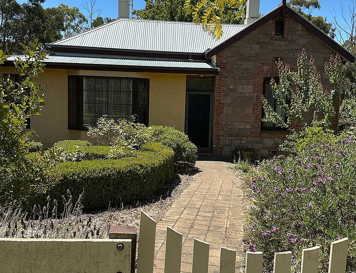 Older stone house on Main Street with front garden and back yard with vegetable garden and space for our kelpie.