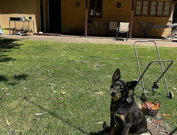 Dog is good natured, energetic, requires daily exercise and sleeps inside at night.