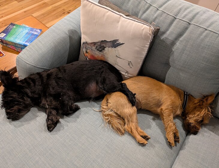 We have a middle aged schnauzer Albie (6) and an 18 month old Australian Terrier Maggie. Albie is a vey chill gentleman who loves to lounge around but loves his daily walks. Maggie is well trained and lively , but also loves a cuddle. She enjoys a daily walk land enjoys a game with her ball. Maggie sleeps in her crate at night and Albie sleeps on his mat in the lounge area. Both are trained to use the doggie doors to go outside. Both can be left for extended periods of time during the day but love your company when home.. Also two budgies and some gold fish that require minimal care.