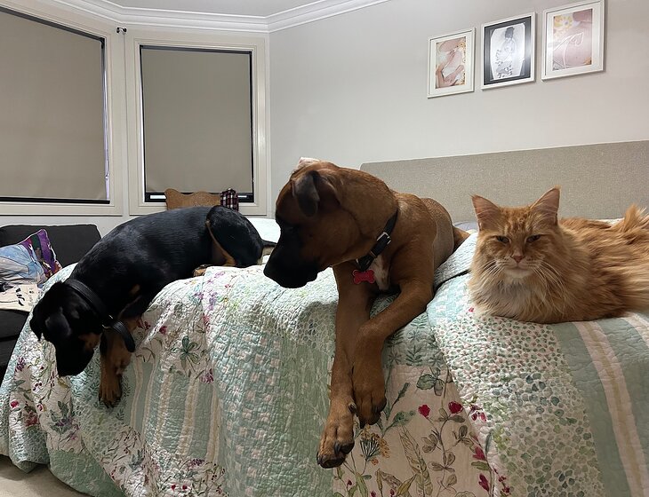 We are looking for a house sitter who loves pets. We have two big affectionate and silly dogs, Titan is a cross of an Staffy, mastiff and cattle dog, Moose is German Shepherd crossed with Maremma and Labrador. We also have a big Maine Coon cat who also loves lots of cuddles.
