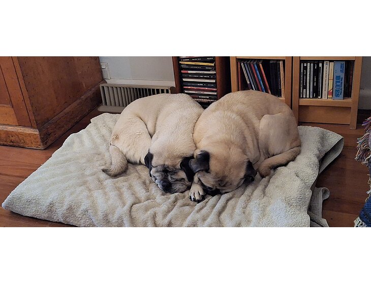 We have two older pugs who eat, sleep and cuddle and love the company of humans and have a strong daily routine they follow.
