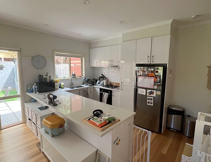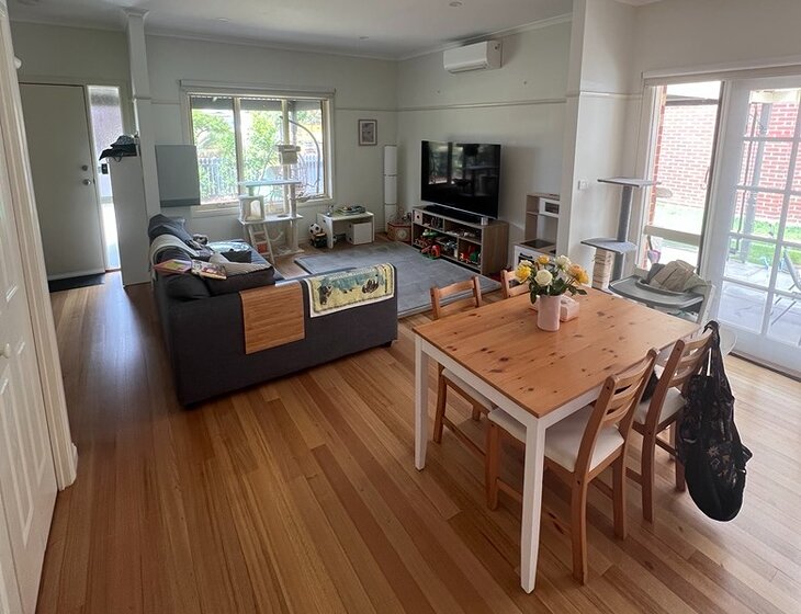 The lower level delivers sunny open plan living, with timber floorboards sweeping through generous living and dining zones to the well-appointed kitchen with stone benchtops, stainless steel appliances and a breakfast bar ideal for casual dining. French doors invite you to dine and entertain alfresco on the covered patio/carport, with the neat back garden beyond providing a safe outdoor area for the cats where they can't escape and go on adventures.