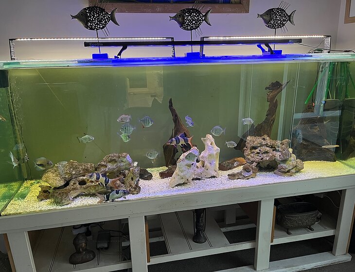 We have one dog named Finn, a fish tank and a pet turtle.
