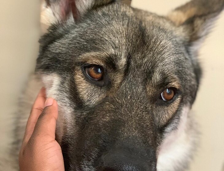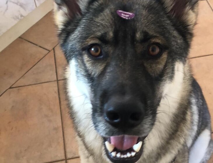 Dog - breed is Shepsky, looks intimidating, not very social, loves food, walks