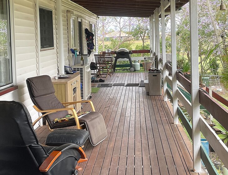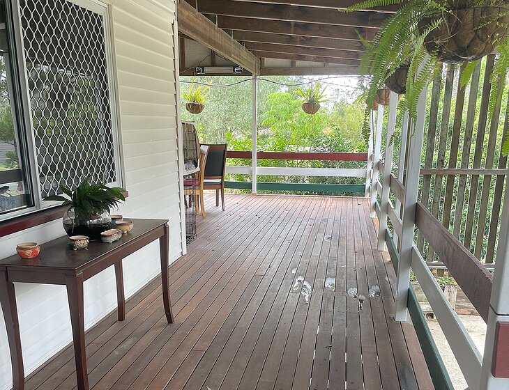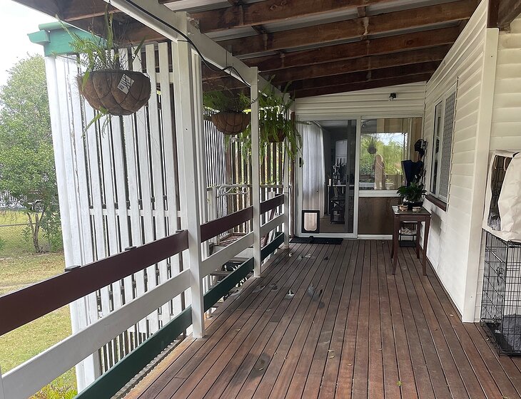 Small 4 bedroom house, fully furnished with a huge deck and verandah. 31/2 acres backing on to Bundamba Creek. Kayaks available. Requirements to only look after the house and the gardens. Not much gardening work, only watering of plants. Mowing of grass. Have a ride on mower. Very secure with electronic gates. We do have a resident python who makes an occasional appearance. Fully screened house with windup/down shutters out the front. Not fully double story as not legal height.