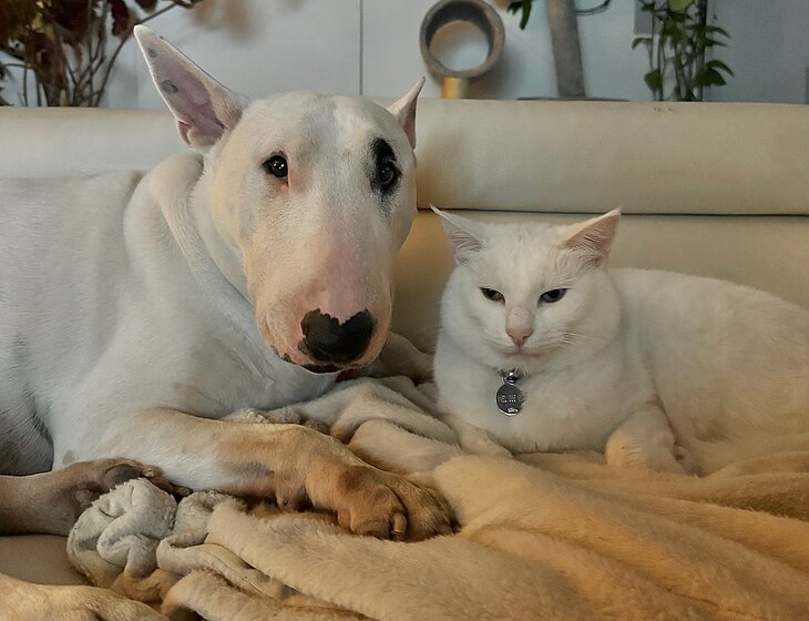 I have 1 bullterrier and 1 cat. Both needy cuddle puddles