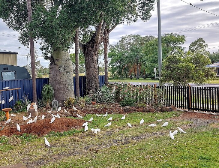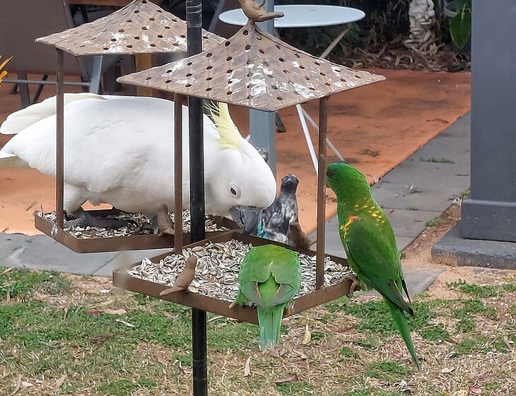 There is a great variety of wild birds visiting our garden – rainbow lorikeets, scaly-breasted lorikeets, galahs, corellas, sulphur crested cockatoos, grass parrots, apostle birds, magpies, soldier birds and a few more species.
