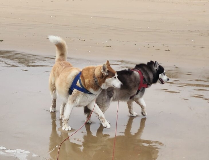 • Both dogs enjoy their daily walks (essential for happy huskies!)