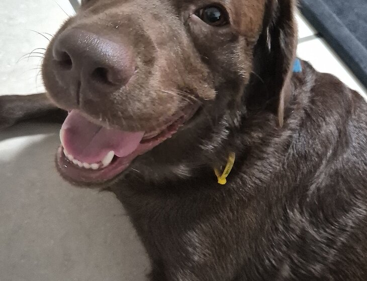 Our dog is a 2 year old chocolate Labrador with alot of energy. He's very friendly but cam be a little jumpy and will lick your legs 😅