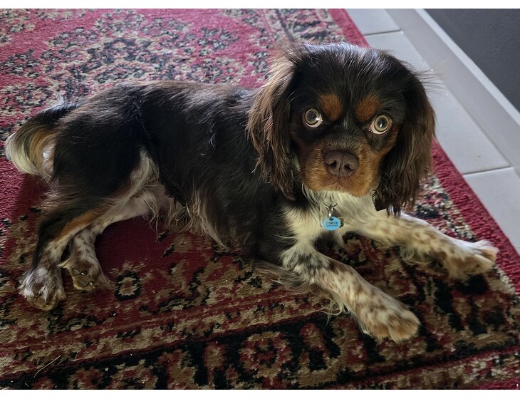 Elvis (just turned 5 year old Tri coloured King Charles Cavallier ) and Bowie, a 10 month old Chocolate Tri King Charles Cavallier with the most amazing green eyes.