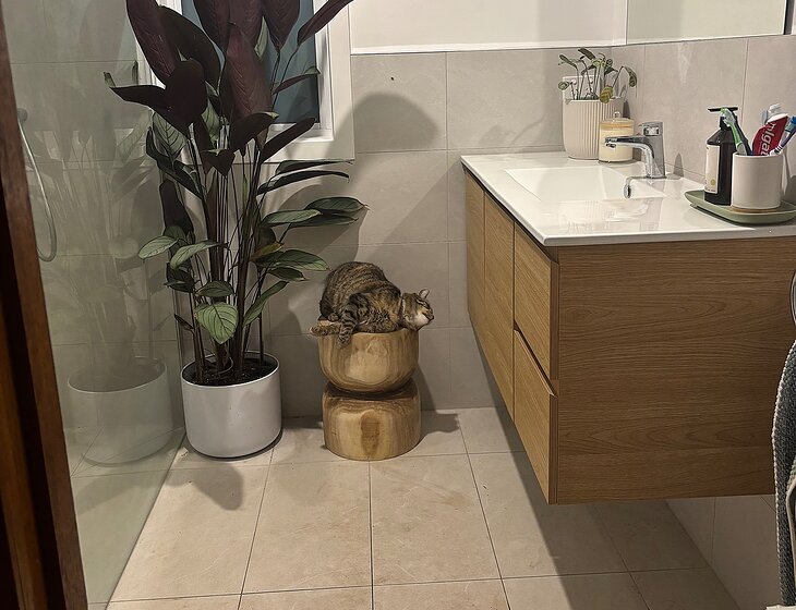 We also have 2 cats, Trevor and Bayleaf; a King Parrot, Wendy; 4 chooks, Angelica, Peggy, Dot and Esther; and two fish tanks (with automatic feeders).