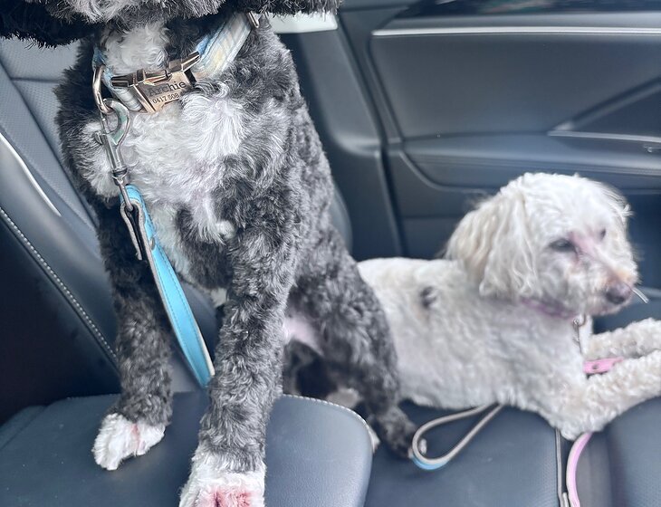 2 cavoodles who bark a lot but can be outside. They usually live inside though. They need feeding twice a day. Morning and night.
