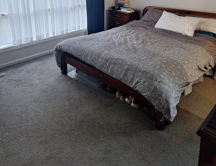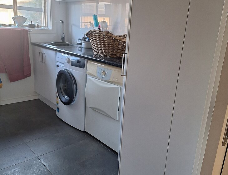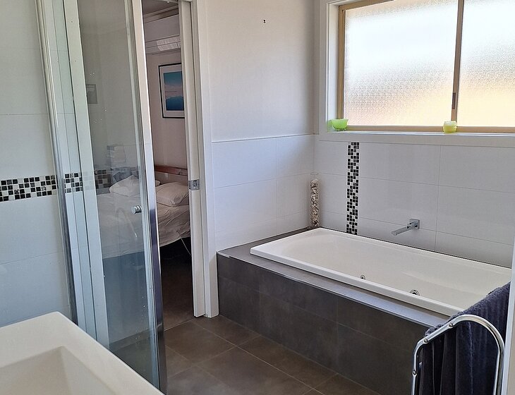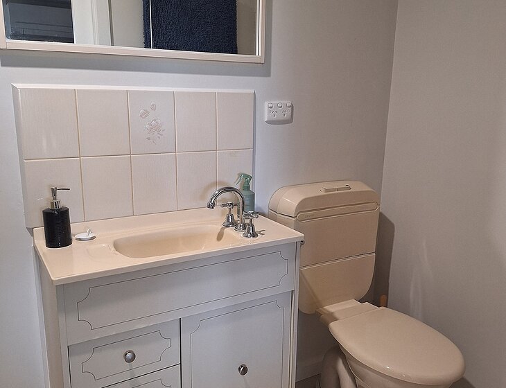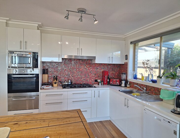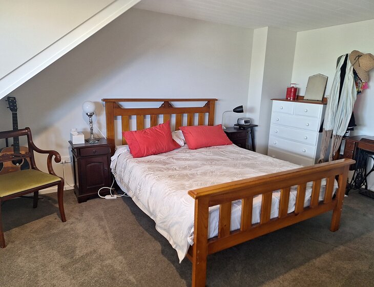 Our home has three bedrooms and a small study. (one of the bedrooms is used as a study). There are two bathrooms, an open kitchen, living, dining area, laundry and an outside entertaining area and garden. Downstairs is a bedroom with an ensuite.
