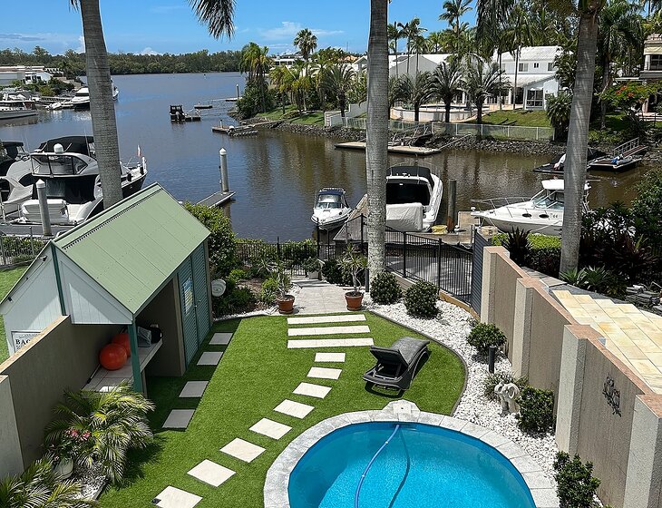 3 bedroom villa plus study with lots of stairs, on the water in a security gated community Have a 6 year old shoodleXpekinese low maintenance garden, pool, numerous potted plants & 2 bonsai