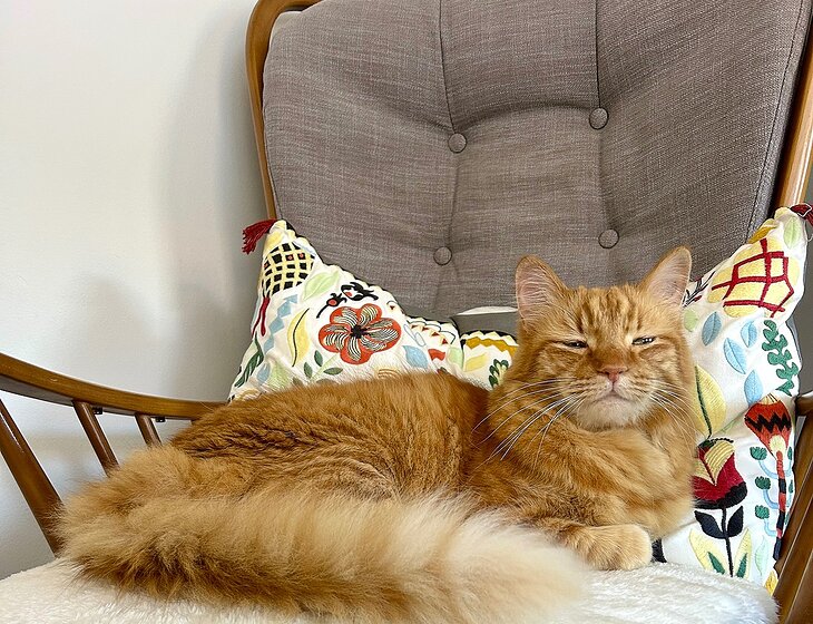 Simba has a cat door and we normally let him out during the day and keep him inside at night. He will require litter box cleaned daily, water bowl to be cleaned and refilled and feeding twice a day. Simba loves napping and cuddles and rarely ventures very far.