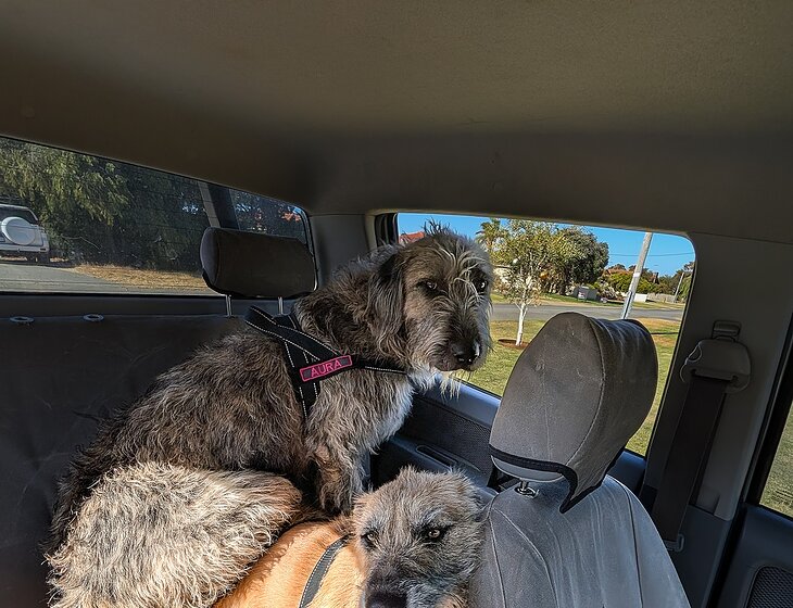 The stars of the show are our two dogs, Luna (wolfhound cross) and Aura (Irish wolfhound). They are gentle giants who love a cuddle and are very easy-going around the house. They are relaxed and well behaved. Luna is 2 and Aura is 1. I will warn you, Aura will jump at any opportunity to sit on you – she thinks she is a teddy bear!!