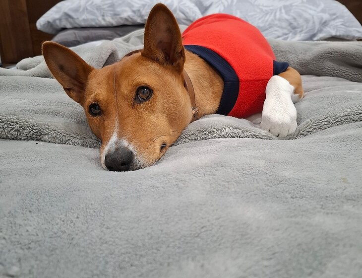 We walk our dog Alfie daily for at least 30 minutes and feed him once a day. He is a six year old basenji and loves to lounge around most of the day.