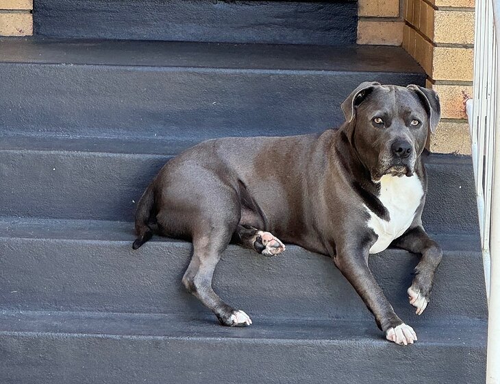 5 year old blue American staffy, indoor/outdoor, very spoilt. Loves playing games, enjoys car rides, loves camping.