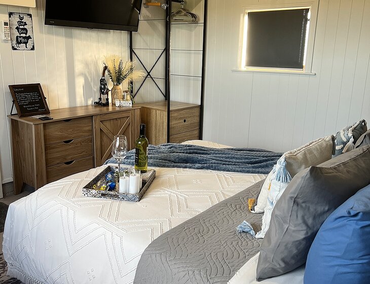 We currently run it as a successful Airbnb with consistent 5-star reviews, but it will be exclusively available for your use during our time away. It features a stunning bathroom with views across the paddocks—perfect for unwinding after a day outdoors.