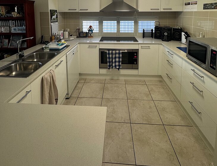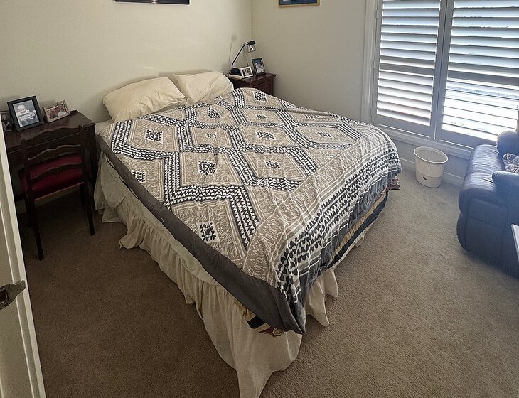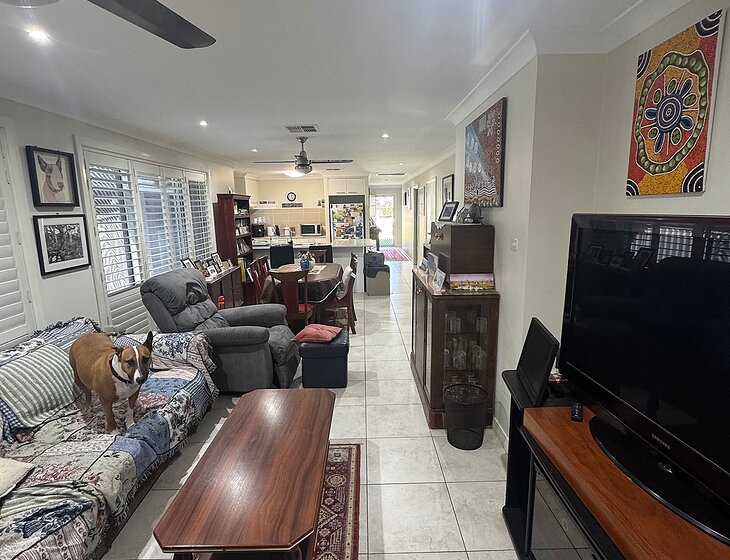 Single Storey Home. Open living plan. 3 Bedroom, one bedroom is used as a storage room and will be locked, one bedroom is the Master Bedroom and will be locked, one bedroom is the guest bedroom with a queen size bed (this will be the house sitter's bedroom). The bathroom is next to this bedroom with the toilet opposite the bathroom. The kitchen is part of the open living area and an extra room is used as the Media/TV room. The kitchen, open living area and TV room are for the sitters use. The garage will have my car parked in it, but the driveway is big enough to park a car on.