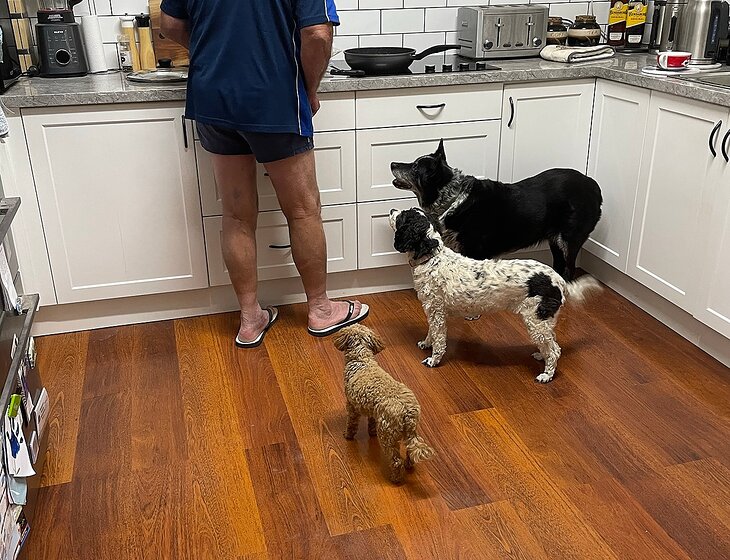 2 small dogs - poodle and a cavoodle 3 and 4 years old. Sleep inside and have free range outside via a doggie door. 1 outside cat, Very old kelpie 15 years old , slow to move on medication.