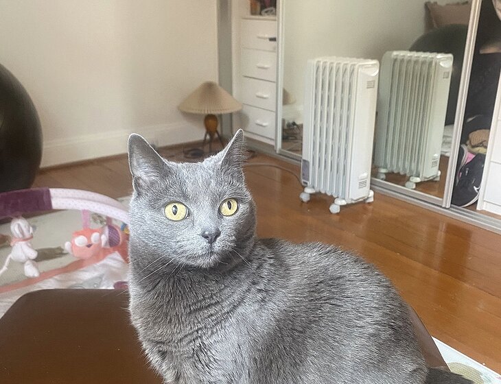 George is an initial introvert, she can be quite cautious of new people but usually warms up to you as long as you're patient! She's not a lap cat but will happily jump up onto the table or beside you on the sofa for a pat or a brush. She is an indoor cat (but likes to sit beside an open window) and is very easy to take care of. She has fresh food and water twice a day, and also likes the shower door open when possible to have some alternative water sources!