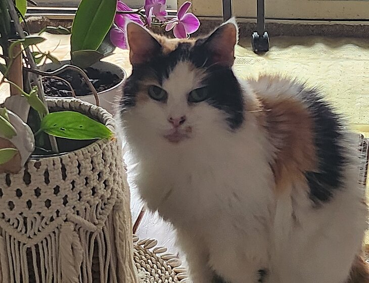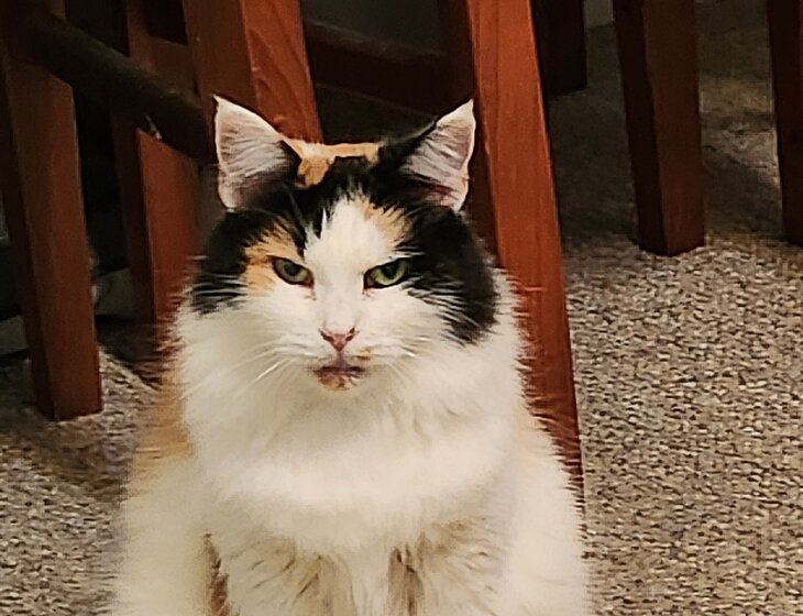 Tortie is a rescue cat very shy likes a pat likes to sit on the lounge with the bird and sits on the balcony in the sun. I require feeding x2 daily and my litter tray changed every couple of days.