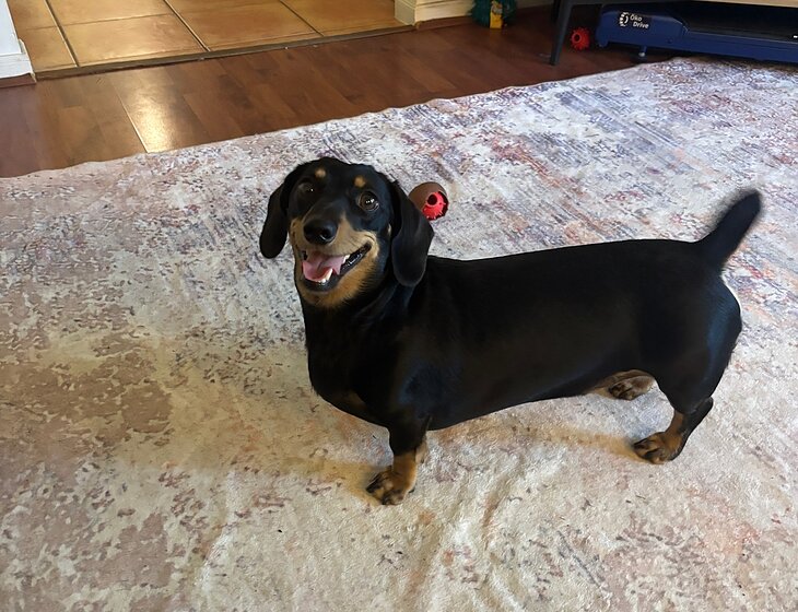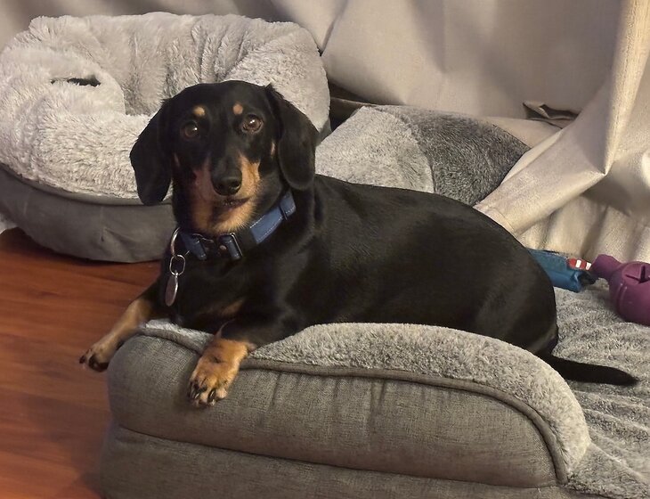 Alfie is a 4yr old Dachshund, who is adorable and loves people. He definitely has little dog syndrome and will bark you down at first but then kiss you like crazy later. He needs to be fed morning and night and to be let in and outside. He is happy to spend the day outside when we aren't home but sleeps inside at night. He loves being inside when the humans are home.