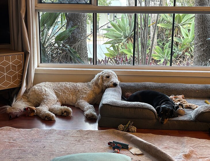 Arlo is our baby of the family; he will have just turned 1yr old when the house sit occurs. He is a groodle (Golden Retriever/Poodle mix) and is essentially a big fluffy teddy. He is toilet-trained and is quite the obedient puppy. He eats morning and night. He loves to play with Alfie and humans.