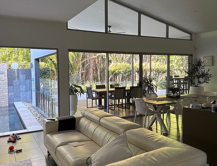 Our home is an open plan with outdoor living which contains a pool & outdoor Kitchen lounge & TV