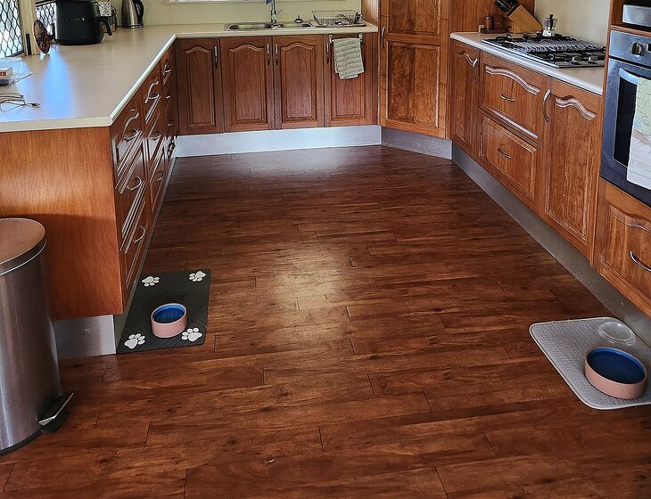 Matisse and Leo move freely inside and out, through a dog door, so there is no need to take them out for toileting. They are able to choose where they sleep at night, sometimes staying outside until the wee hours when they come in and hop on my bed. They also enjoy the couch.