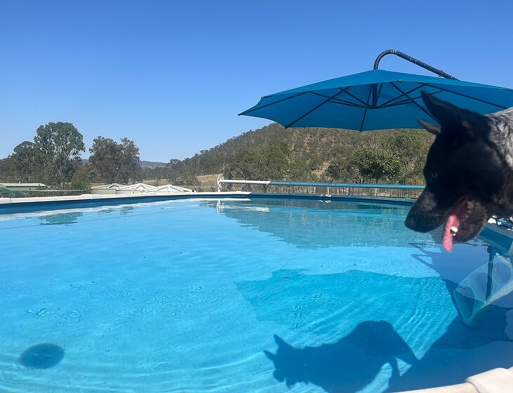 Our Roxy puppy loves the idea of the pool, as long as she doesn't have to get in it. She prefers wadding in the dams were her feet are always touching the bottom. We walk her around the paddocks twice a day and play ball with her in the mornings while we're having a cuppa. She is a 3yr old Australian stumpy tail cattle dog and a bundle of energy! She's an outside dog with a mat just inside the door that she is alound to sit on if we let her inside for a short while. She has her kennel for sleeping. Right now she has 10 puppies, but we’re hoping all but 1 have new homes by March. We’re planning on keeping on of the boys so now there will be a puppy as well as Roxy.
