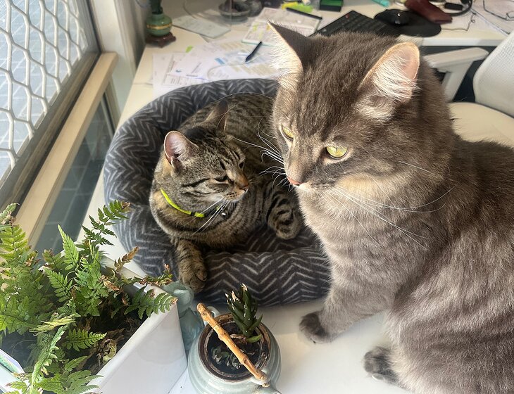 Our cats, Silver (the fluffy one) and Tonto (the tabby) are brothers and love to be around us. They usually sleep on the bed with us and love being in the same room. They don't like being picked up, but will sit on our laps if we sit still long enough and love cuddles when they come in from being outside. They are also content to be towel dried if they come in wet :).