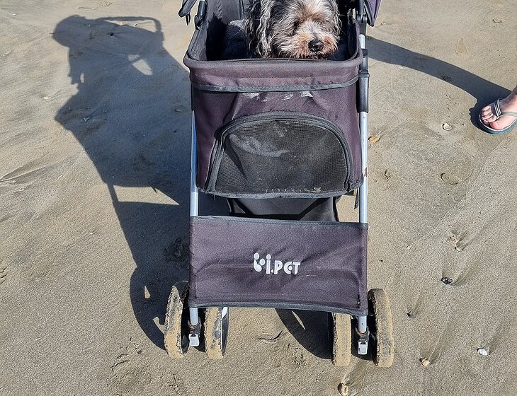 Benji is 18 years old, he needs a pusher to go for his wee breaks. He loves having time on the grass by the beach sniffing around. He eats and drinks well, Benji sleeps longer now.