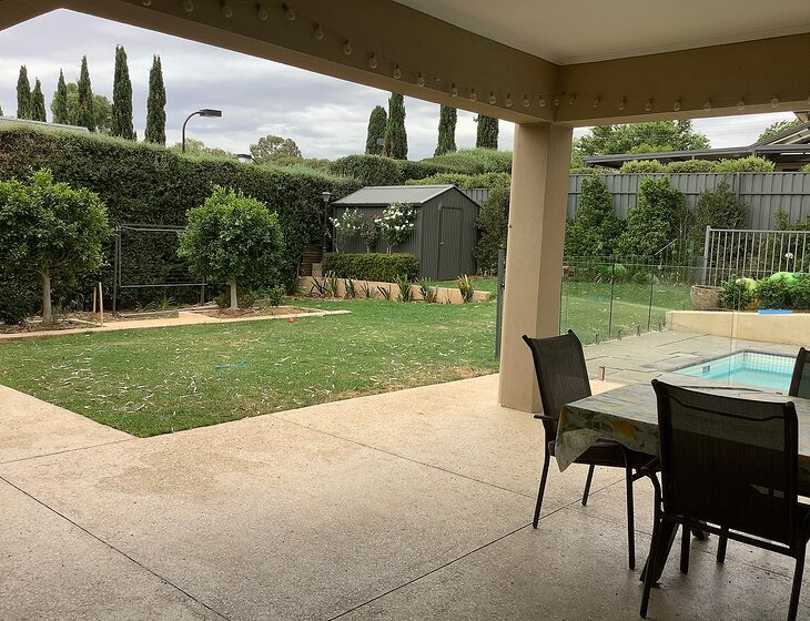 We have a 4- bedroom family home with a medium sized low-maintenance yard including a pool. Basic mowing, watering and sweeping of leaves may be required. There is a large circular driveway which can accommodate multiple cars and/or a caravan.