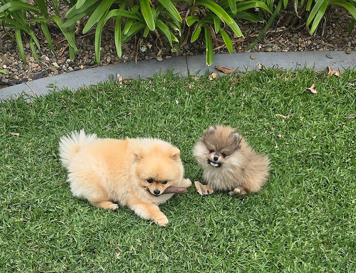 Feeding two x toy pomeranians twice per day and taking them for a walk/playing with them.