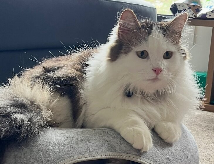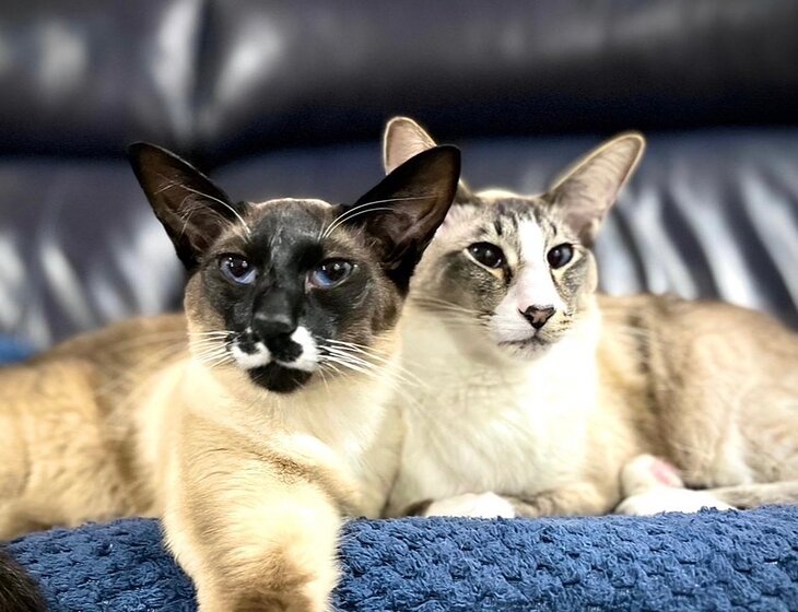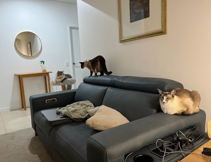 4 cats - we have 2 six year old Balinese boys who are very easy going. They love to hide and sleep and are very independent, but want to know that their people are around. We also have two 18 month old Siberian cats, one boy and one girl. These two are a little more adventurous and love to play. They still get fits of the zoomies which is always fun to watch. The cats all share a few bowls of dry food and they all graze at different times. We just make sure their bowls are filled up each day and they can eat when they get hungry.