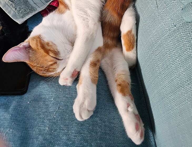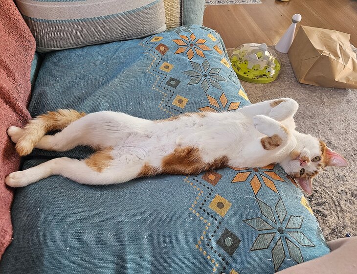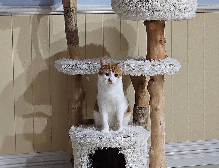 Kitaro is happy if he has his biscuits are full, don't be concerned if he won't eat his main meal he's not too fussed on that, but will eventually eat. He's a little shy, but if you give him his treats he'll easily warm up. He is a very sweet natured puss, who loves to talk- literally and play. He is a typical ginger, with the personality to match!