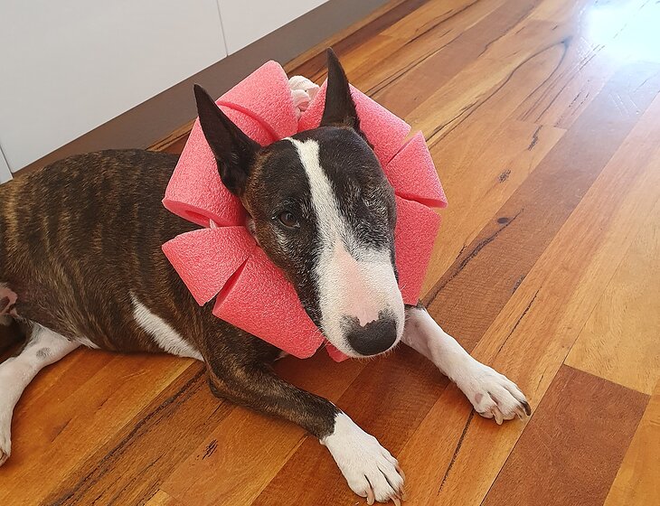 Our dog is one spoilt, mischievous, affectionate, very people friendly 9 year old turning 10 miniture English bull terrier dog, who requires mostly daily walks but does not like other dogs. Sadly she has only one eye and has limited vision in her remaining eye, but manages and navigates everything extremely well considering. She also requires daily administration of medication every morning, but she has no issues taking it.
