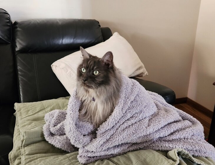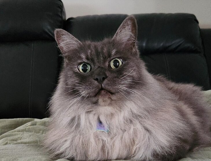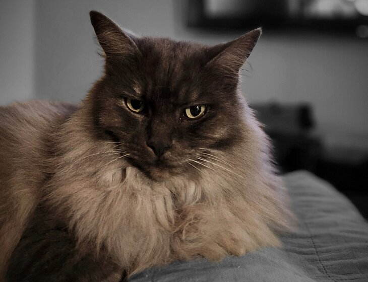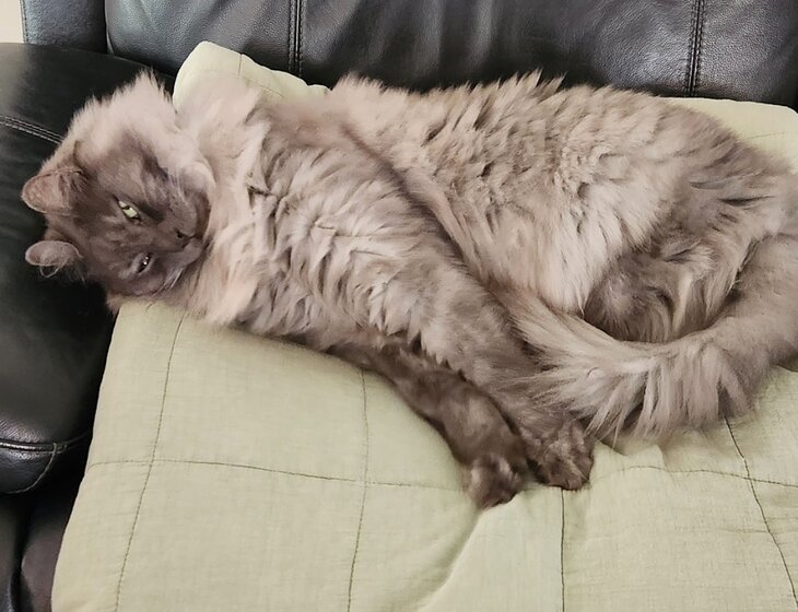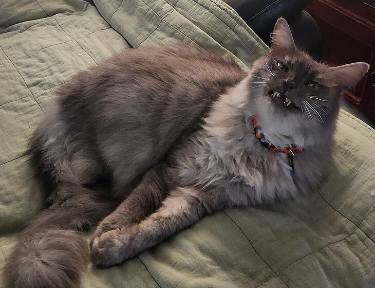 Just joking, he is the most chill cat ever - just look at that smile!. Very self sufficient like a typical cat, but loooves company and will come running to greet you at the door (and lead you to his food bowl).